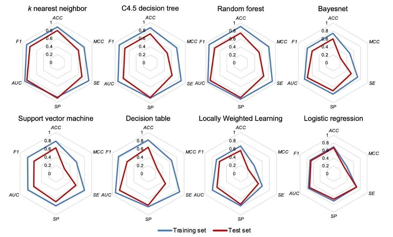 基于机器学习建立IVIVE模型,将细胞水平的生物效应与啮齿类动物的体内肺毒性联系起来,在训练集和测试集中的预测准确率分别达到89%和80%。如图3所示,经10折交叉验证与网格搜索优化参数,在8种机器学习算法中,kNN、C4.5和RF表现优异。模型评估结果显示,kNN模型训练集准确率达89%,测试集准确率为80%;RF模型训练集准确率91%,测试集准确率75%;C4.5模型训练集准确率87%,测试集准确率72%。