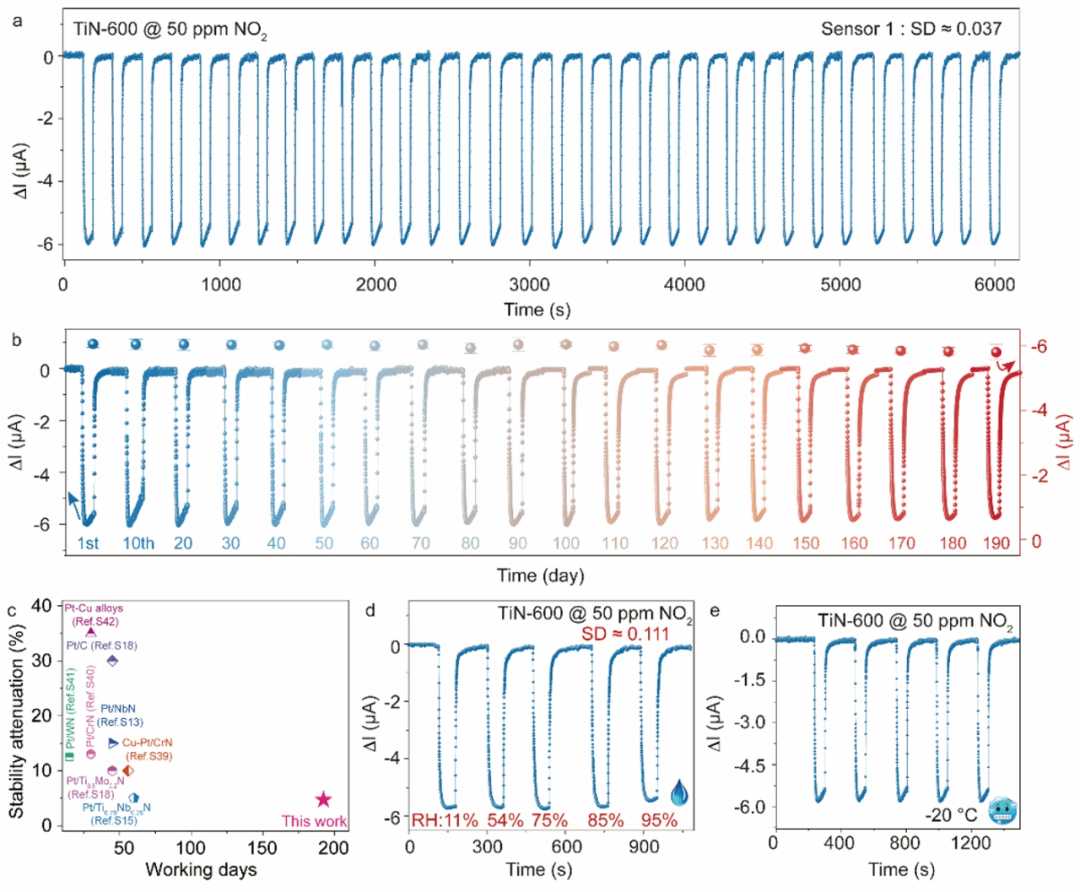 2.TiNx传感器表现出卓越的气敏性能,包括对NO2的高选择性,其响应信号远超其他干扰气体;良好的环境适应能力,即使在高湿度或低温条件下,仍能保持稳定性能;以及出色的长期运行稳定性,在长达6个月的测试中仅出现轻微的性能衰减。