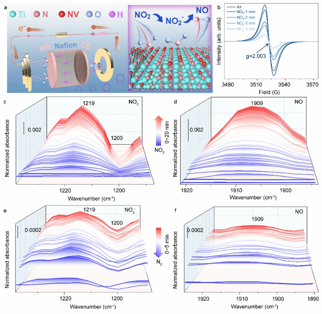 TiN-600电化学气体传感器的工作机制是基于NO2分子在工作电极(WE)处的还原反应。当NO2分子接触WE时,首先被还原为中间体NO2⁻,随后进一步还原为NO。同时,在对电极(CE)上发生氧化反应,生成的质子(H+)通过Nafion膜迁移至WE,而电子(e-)无法穿过Nafion膜,只能通过外部电路返回WE。这一电子转移过程在外电路中产生可检测的电流信号。当NO2气体分子吸附到TiN-600表面时,形成的气体层增强了自旋-晶格相互作用,导致EPR信号减弱。随着吸附分子数量的增加,气体层变得更厚且更致密,从而进一步降低EPR信号强度。利用原位FTIR技术对NO2的传感反应进行了深入分析,揭示了反应过程的详细机制。在TiN-600催化作用下,检测到位于1200 cm-1和1219 cm-1的特征振动峰,分别归属于NO2⁻和桥联亚硝酸根。随着反应进行,气态NO的特征振动峰(1909 cm-1)逐渐增强,表明存在NO2⁻作为中间体。当引入N2气体时,这些特征峰在5 min内完全消失,说明NO2⁻和气态NO迅速从催化剂表面解吸。