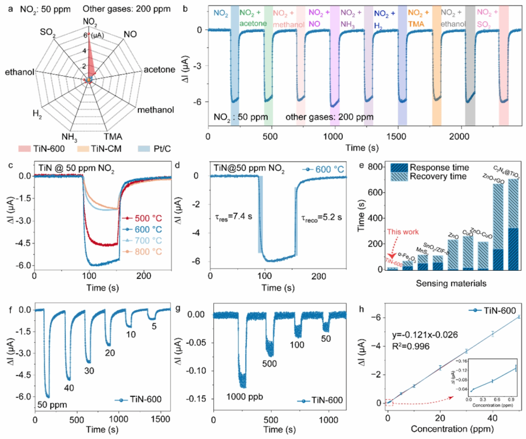 选择性是评估气体传感器性能的重要指标。TiN-600传感器对NO2的响应远优于TiN-CM和Pt/C传感器,同时对多种干扰气体的响应几乎可以忽略。其对NO2的响应时间和恢复时间分别为7.4 s和5.2 s,是所有测试TiN样品中最快的。与其他类型的NO2气体传感器在响应和恢复时间上的性能对比进一步证明,采用MOF衍生方法制备的高活性TiN-600在传感应用中具有显著优势。此外,TiN-600传感器在50 ppb至50 ppm的浓度范围内对NO2展现出良好的正线性响应,灵敏度达到0.12 μA/ppm。