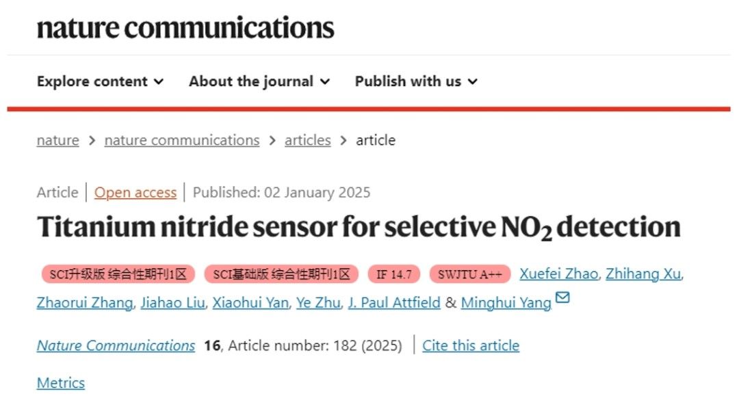 Xuefei Zhao, Zhihang Xu, Zhaorui Zhang, Jiahao Liu, Xiaohui Yan, Ye Zhu, J. Paul Attfield and Minghui Yang*,Titanium Nitride Sensor for Selective NO2 Detection,Nature Communication, 2024, DOI: 10.1038/s41467-024-55534-x
