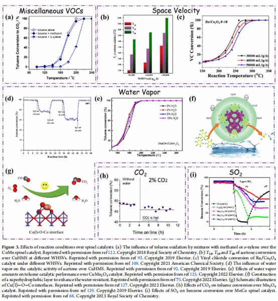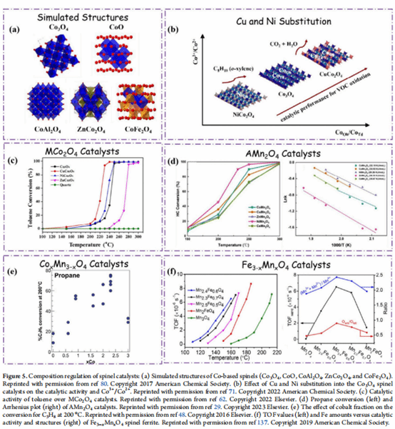 催化性能: 尖晶石催化剂在多种VOCs的催化氧化中表现出优异的性能,特别是在低温条件下。研究总结了不同尖晶石催化剂对甲烷、丙烷、甲苯等VOCs的催化活性,并比较了其性能。