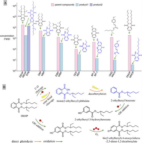 图2.母体化合物及其转化产物的浓度 (A);PPN (B) 中 DEHP 的拟议转化途径(在 1 级鉴定的转化产物以蓝色表示,BP-1 是 2,4-二羟基二苯甲酮,4MCA 表示 4-甲氧基肉桂酸,MNOP 代表邻苯二甲酸单辛酯)。