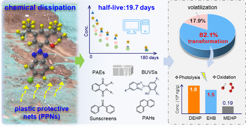 本研究对三种塑料防护网中20种 “优先关注” 化学物质(包括防晒剂、邻苯二甲酸酯、苯并三唑类紫外线稳定剂和多环芳烃)在180天内的户外耗散情况进行量化分析。结果显示,防晒剂和多环芳烃的含量在5天内降至初始浓度的50% 以下。通过整合转化过程的改进传质模型,能较好地再现耗散动力学(中位决定系数R^2=0.82),表明耗散过程中释放与转化同步发生。这些化学物质的平均耗散半衰期为19.7天,且与分子中的孤电子对数和碳原子数呈正相关。出乎意料的是,转化对化学物质总耗散的贡献率达82.1%,在邻苯二甲酸二(2 - 乙基己基)酯(DEHP)和UV - 326等物质中尤为明显。对塑料防护网中生成产物的可疑筛查表明,光解、臭氧和羟基自由基诱导的氧化是主要转化过程,2 - 乙基己基苯甲酸酯产物浓度与母体DEHP相当,证实了这一点。这些发现突出了转化在塑料化学物质耗散中的关键作用,有助于更精确地评估化学物质排放,并为未来开发环境友好型塑料提供参考。