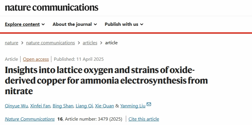 2025年4月11日,永利集团官网刘艳明教授团队在Nature Communications期刊发表题为“Insights into lattice oxygen and strains of oxide-derived copper for ammonia electrosynthesis from nitrate”的研究论文,团队成员吴钦岳为论文第一作者,刘艳明为论文通讯作者。