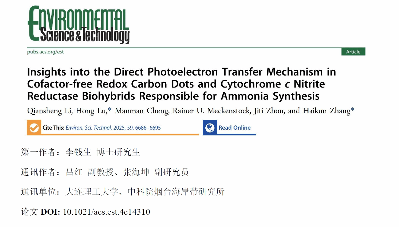 近日,3044am永利集团3044noc吕红副教授与中科院烟台海岸带研究所张海坤副研究员合作,在环境领域权威期刊Environmental Science & Technology上发表了题为“Insights into the Direct Photoelectron Transfer Mechanism in Cofactor-free Redox Carbon Dots and Cytochrome c Nitrite Reductase Biohybrids Responsible for Ammonia Synthesis”的研究论文。该论文构建了一种无细胞的NrfA/R-CDs光敏生物杂合系统,探讨了NrfA与氧化还原性碳点(R-CDs)之间的界面光电子转移过程,并揭示了R-CDs介导直接光电子转移的关键结构。