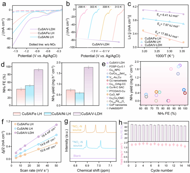 电化学测试结果表明,CuSA/V-LDH展现出优越的电催化性能,相较其他对照催化剂表现出最低的表观活化能(6.41 kJ mol-1)和最高的氨产率(1.78 mg h-1 cm-2)。同位素标记实验证实氨产物源于硝酸盐的还原过程。此外,催化剂在15次循环测试后性能无明显衰减,体现出优异的稳定性与可重复性。