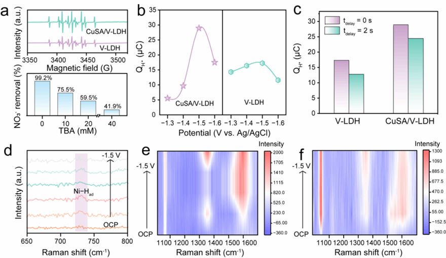 EPR与SI-SECM定量分析表明,CuSA/V-LDH表面的H*浓度更高且寿命更长,表明其具有更强的H*生成与稳定能力,这有利于中间体逐级加氢。原位拉曼谱表明,CuSA/V-LDH表面清晰观察到Ni-Had和*NO₃、*NH₃特征峰,证实其对硝酸盐活化及后续氢化反应均有显著促进作用。