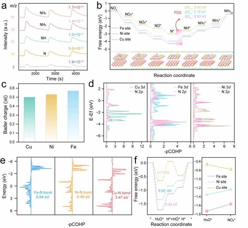 通过原位差分电化学质谱明确了硝酸盐还原的反应路径,反应过程中未检测到氮气副产物。DFT计算表明,Cu位点降低N*氢化决速步能垒,而LDH载体优先吸附水解离产H*,双位点分工实现“H*生成-利用”路径协同,从热力学与动力学层面抑制HER竞争,提升产氨效率。