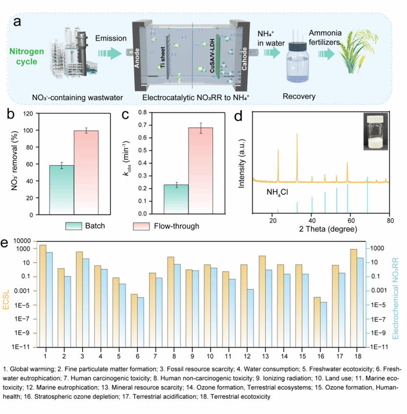 构建CuSA/V-LDH@CNT膜电极并集成穿透式反应器,硝酸盐去除率达99.3%,氨产物以NH4Cl形式回收。生命周期分析显示,相较传统浓缩-填埋工艺,该技术全球变暖潜势(GWP)降低90%,环境毒性潜势(TE)减少94%,兼具经济与环境效益。