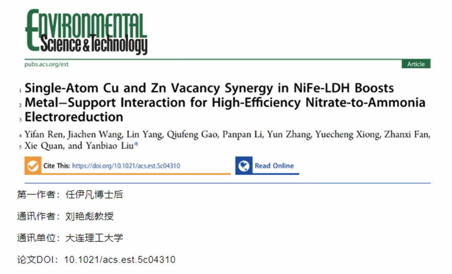 近日,3044am永利集团3044noc刘艳彪教授团队在环境领域期刊《Environmental Science & Technology》上发表最新研究成果。该研究聚焦于水质安全与清洁能源的双重需求,提出一种“单原子铜–锌空位协同催化”策略,通过在原子尺度上精确控制金属与载体的相互作用,构筑了CuSA/V-LDH双位点结构,有效提升电催化硝酸盐还原产氨的反应活性与选择性。该技术不仅可有效去除水中硝酸盐,还能将硝酸盐转化为高附加值的氨产品,为构建“水-能源”循环经济体系提供了新的思路与技术支撑。