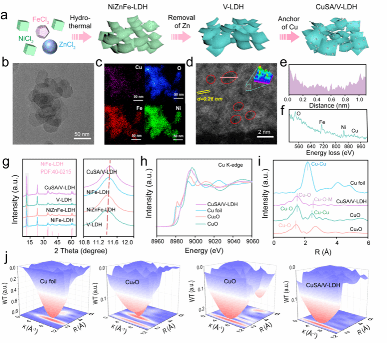 利用碱刻蚀法选择性去除Zn原子构建金属空位(V-LDH),并利用配位吸附实现Cu单原子精准锚定。XRD与XAFS分析表明,Cu单原子以Cu-O和Cu-O-M(M=Ni/Fe)配位形式存在,空位诱导的晶格畸变显著增强金属-载体相互作用,为高效催化提供稳定活性界面。