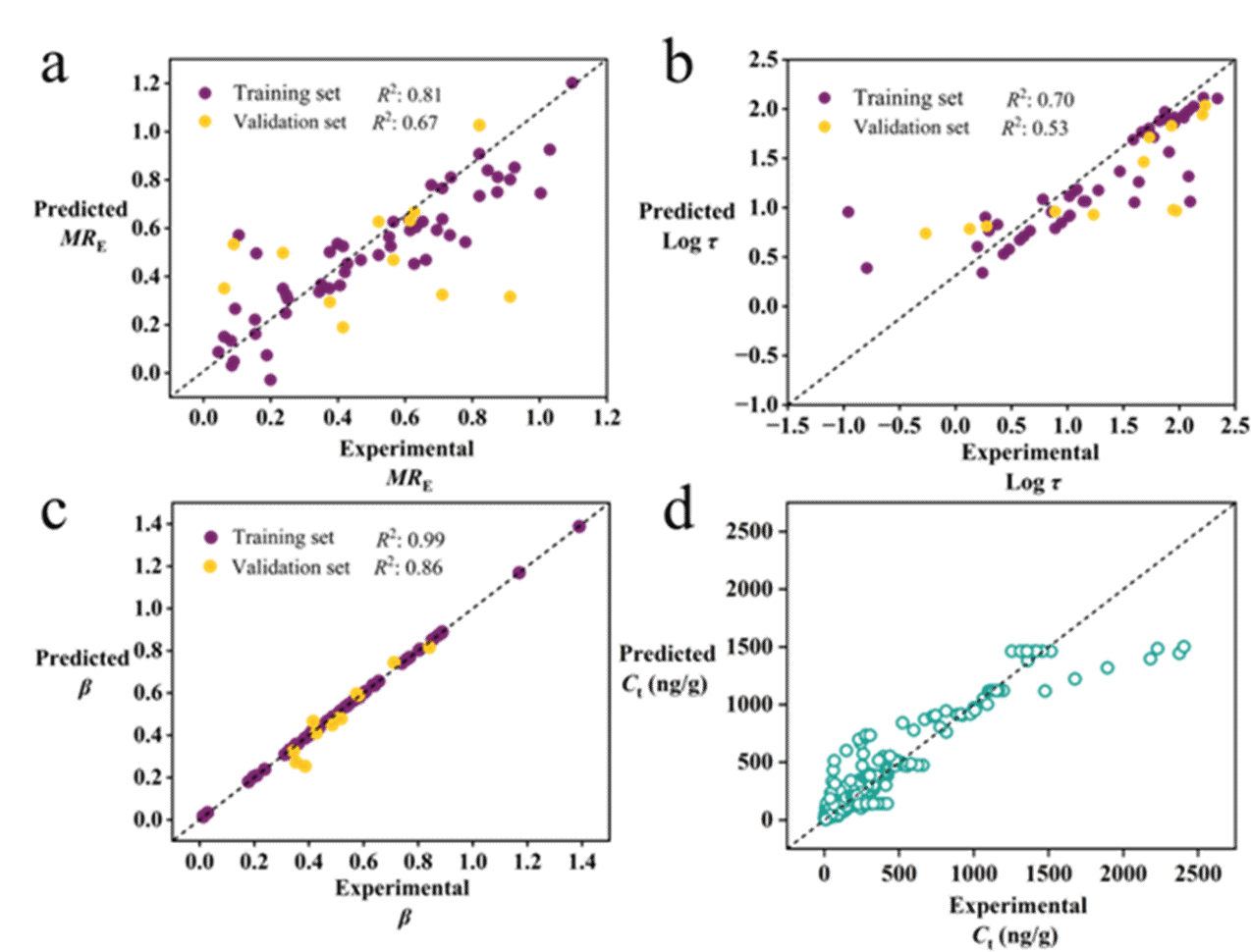 图3. 实验值与预测值的散点图:(a) 平衡迁移率(MRE),(b) Log τ,(c) β,以及(d) 从新鲜果蔬包装迁移到模拟物中的添加剂浓度(Ct)