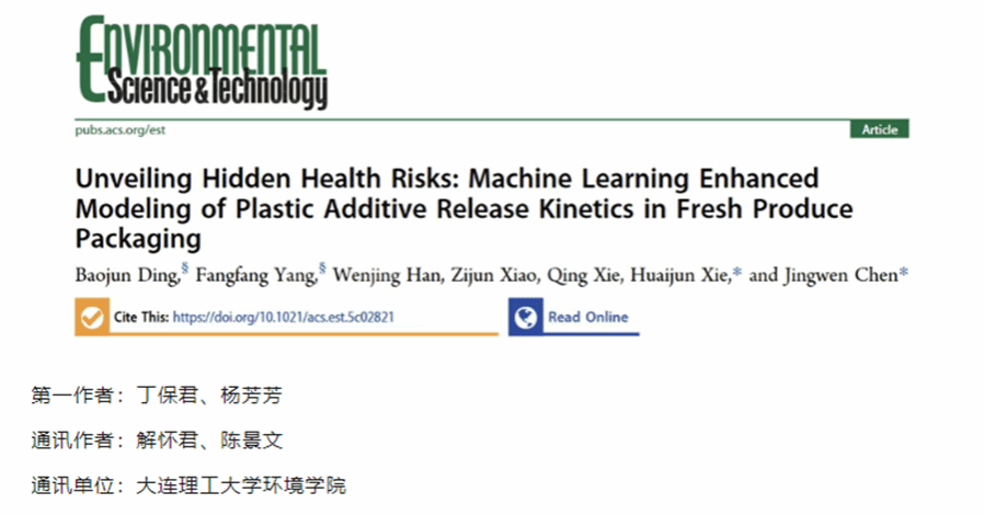 近日,3044am永利集团3044noc解怀君副教授和陈景文教授研究团队在环境领域著名学术期刊Environmental Science & Technology上发表了题为“Unveiling Hidden Health Risks: Machine Learning Enhanced Modeling of Plastic Additive Release Kinetics in Fresh Produce Packaging”的研究论文。该研究聚焦于新鲜果蔬包装(FPP)中的塑料添加剂,通过结合Weibull模型与机器学习技术,对73种常用添加剂在六类FPP样本中的赋存特征及迁移规律进行了评估。研究发现,43种添加剂在FPP样本中的浓度范围为1.52 × 103至2.51 × 106 ng/g,添加剂的迁移率受温度、FPP材料结构及添加剂性质等因素影响,迁移率从10.5%到完全迁移不等。特别是泡沫包装中的添加剂展现出最快的迁移速率和最高的迁移率。基于实验数据,进一步创建了基于人工智能的添加剂释放速率关键参数预测模型。研究还发现,2-乙基己酸(EHA)和磷酸三乙酯(TEP)从FPP迁移到水果和蔬菜中,可对人群健康带来风险。