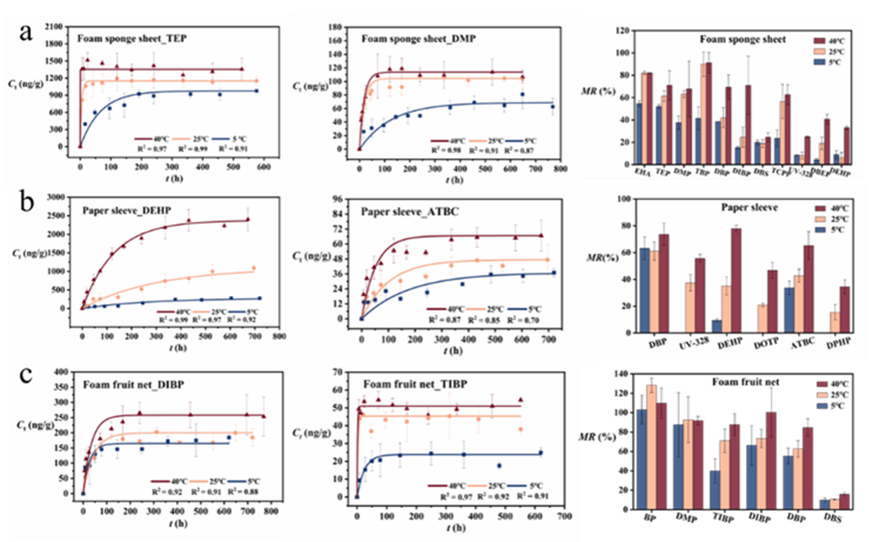 本研究对六类FPP中的添加剂进行了定性与定量分析,系统测定了不同温度条件下添加剂从FPP中的迁移动力学过程,并采用威布尔(Weibull)模型结合机器学习技术对迁移过程进行建模。通过将迁移数据与食品消费指标结合,研究评估了从FPPs中迁移出的有害物质每日摄入量,进而揭示其对人体健康的潜在影响。