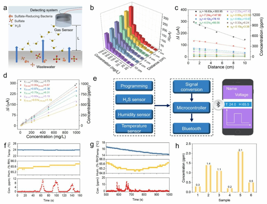 图4. 实际应用测试。(a)废水测试图示意图;(b)浓度、距离与响应值关系图;(c)硫离子浓度与响应电流及对应H2S浓度关系图;(d)距离与响应电流及对应H2S浓度关系图;(e)电路硬件逻辑框图;(f)实验室和(g)湖泊实际监测数据;(h)人工湖不同位置H2S浓度。