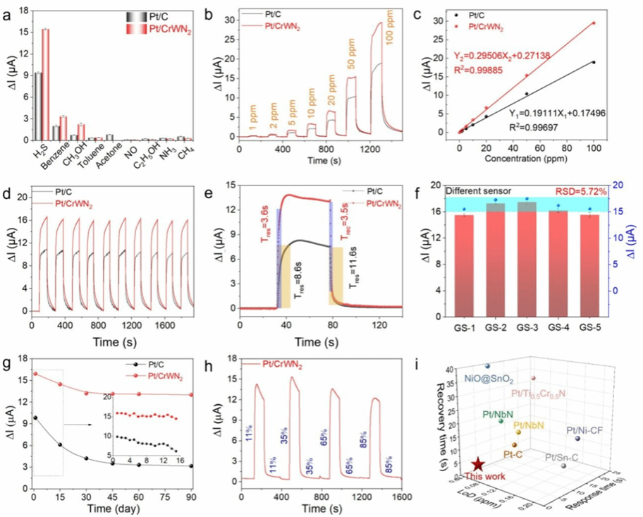 图2. 传感器性能。(a) 传感器对50 ppm气体的选择性;(b) Pt/CrWN2传感器对1-100 ppm H2S响应-恢复曲线;(c) Pt/CrWN2传感器的响应电流与气体浓度之间的关系;(d) Pt/CrWN2传感器的重复性;(e)传感器的响应-恢复时间对比;(f)传感器制备工艺重复性。(g) Pt/C 和 Pt/CrWN2传感器90天的长期稳定性测试;(h)Pt/Pt/CrWN2气体传感器在不同湿度水平下对50 ppm H2S的响应-恢复曲线;(i)H2S传感器性能比较。