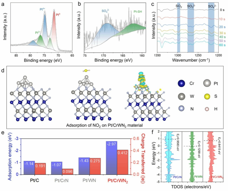 图3. 传感器敏感机制。(a)Pt 4f和(b)S 2p吸附H2S后的高分辨率XPS光谱;(c)Pt/CrWN2材料吸附H2S后的原位FT-IR光谱;(d)Pt/CrWN2优化后的H2S 吸附结构模型;(e) 四种材料的吸附能和电荷转移图;(f) Pt/CrN、Pt/WN 和 Pt/CrWN2的态密度。