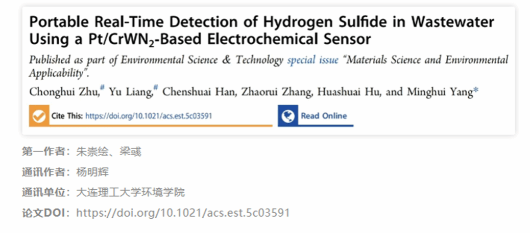 Chonghui Zhu,# Yu Liang,# Chenshuai Han, Zhaorui Zhang, Huashuai Hu, and Minghui Yang*. Portable Real-Time Detection of Hydrogen Sulfide in Wastewater Using a Pt/CrWN2‑Based Electrochemical Sensor.Environ. Sci. Technol. 2025.