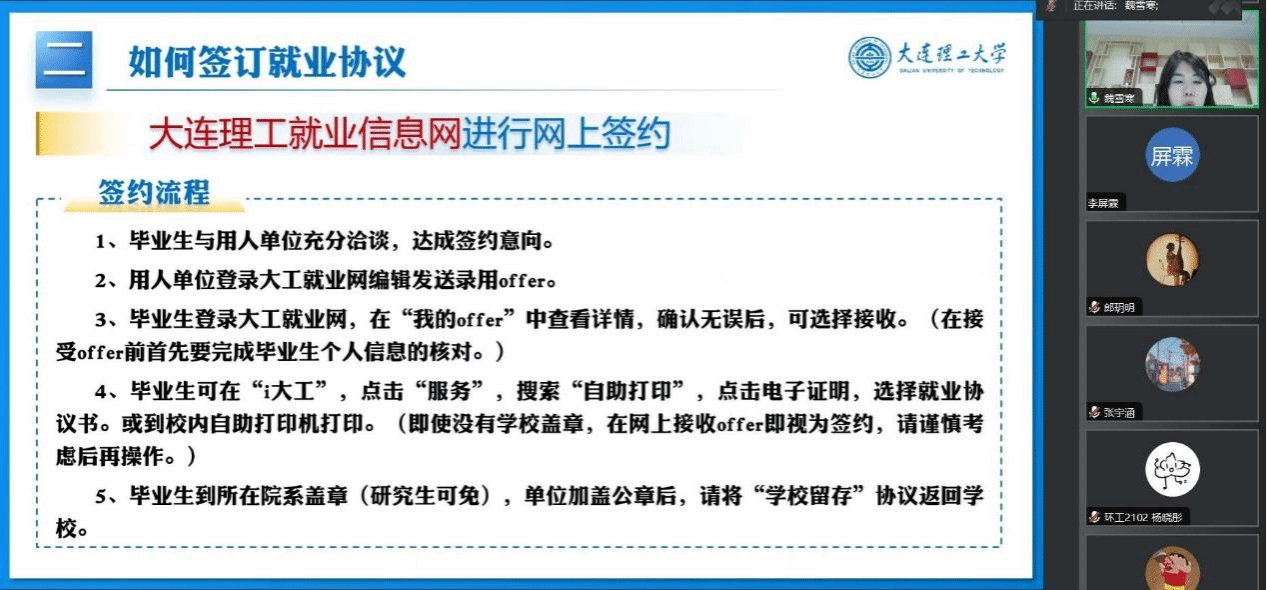 随后,刘倩老师从完善生活保障、促进多渠道就业等五个方面向同学们普及大连市就业政策,鼓励毕业生留连留辽,为东北振兴与国家发展贡献自己的力量。然后从毕业生如何签订就业协议、如何办理违约及相关注意事项进行说明。最后,呼吁同学们积极参与学院“大学生就业核心能力提升训练营”相关活动,提前明确未来发展定位,做好合理的职业规划。