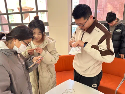 大家动手制作穿绳挂线。老师、同学们互相帮助,一起动手制作,准备开始室外的“探险之旅”。他们兴致勃勃地讨论如何更好寻找植物,展现团队合作风采。