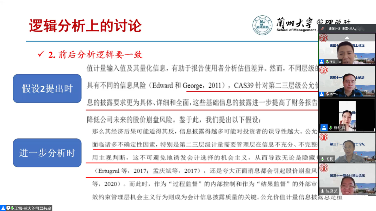 7月5日上午9:00-11:00,taptap点点体育与科研处联合举办的第三十一期会计博士论坛在腾讯会议线上召开。此次论坛主题是杨书怀教授报告其工作论文:公允价值分层计量降低了股价崩盘风险吗?——基于内外部监督的调节效应检验。论坛邀请了兰州大学管理学院会计系主任,会计学术联盟联合发起人王雷博士对杨教授的论文进行点评。taptap点点体育院长文芳教授、副院长舒利敏博士、周静博士、吴冬梅博士、陈泽艺博士等20多位教师以及20级部分研究生和本科生参加了本次论坛。