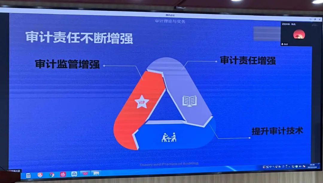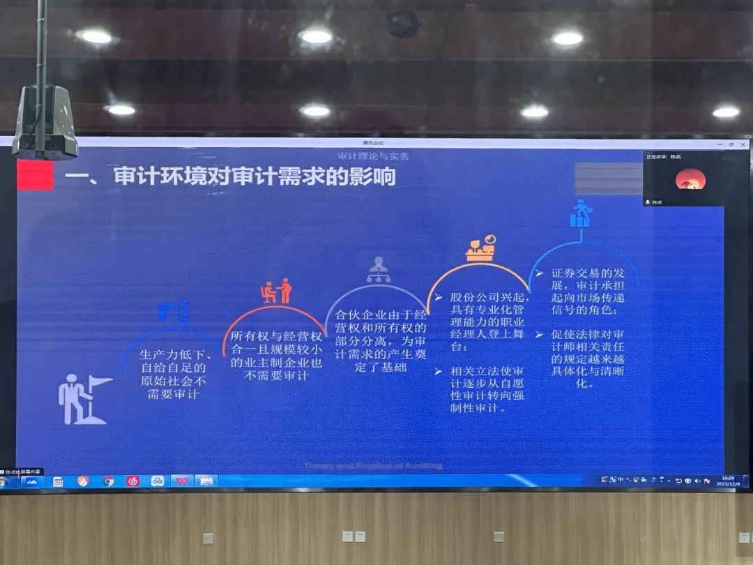 陈老师讲述了审计环境的不断演变以及各个时代对审计需求的变化。进一步从四个模块详细讲述不同审计环境对审计需求的影响,更加具体化为同学们展示了审计环境对审计需求的影响。