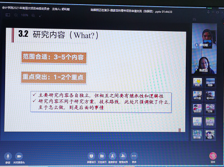 陈晖丽老师从近年来国家自科基金管理学部项目立项资助情况、前期准备、申请书撰写与相关注意事项等四个方面,分享了自己申报国家自科基金的成功经验。她指出,首先要科学确定选题,注重摘要的撰写,立项依据要充分展示项目研究的意义和创新;研究内容要做到重点突出,逻辑严谨,工作量适度;研究方案要做到思路清晰,方法可行,技术路线明确。最后,她特别强调要注重细节,尽早准备,并预祝大家申报成功。
