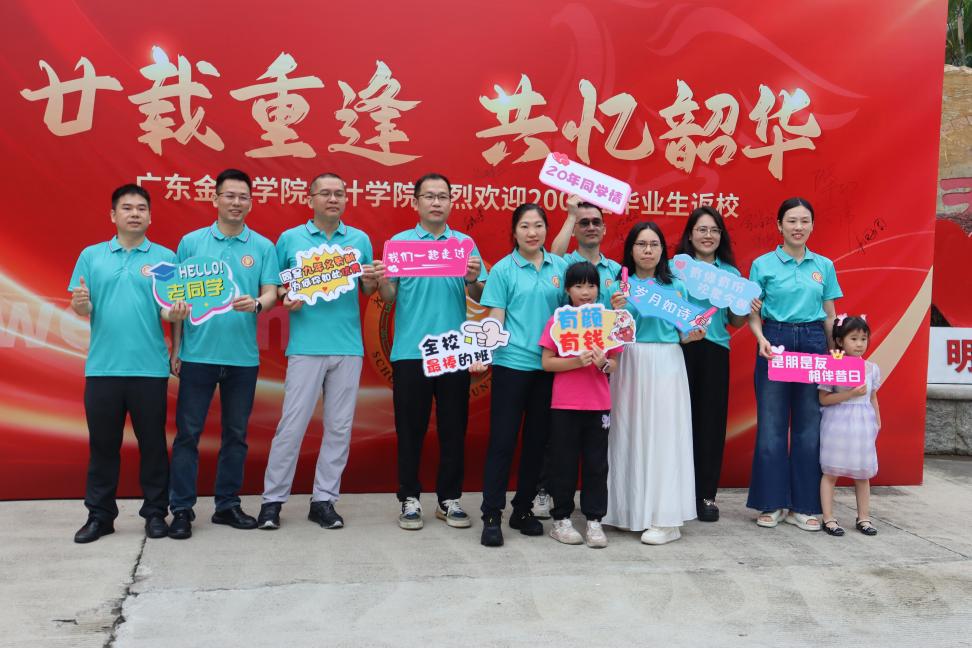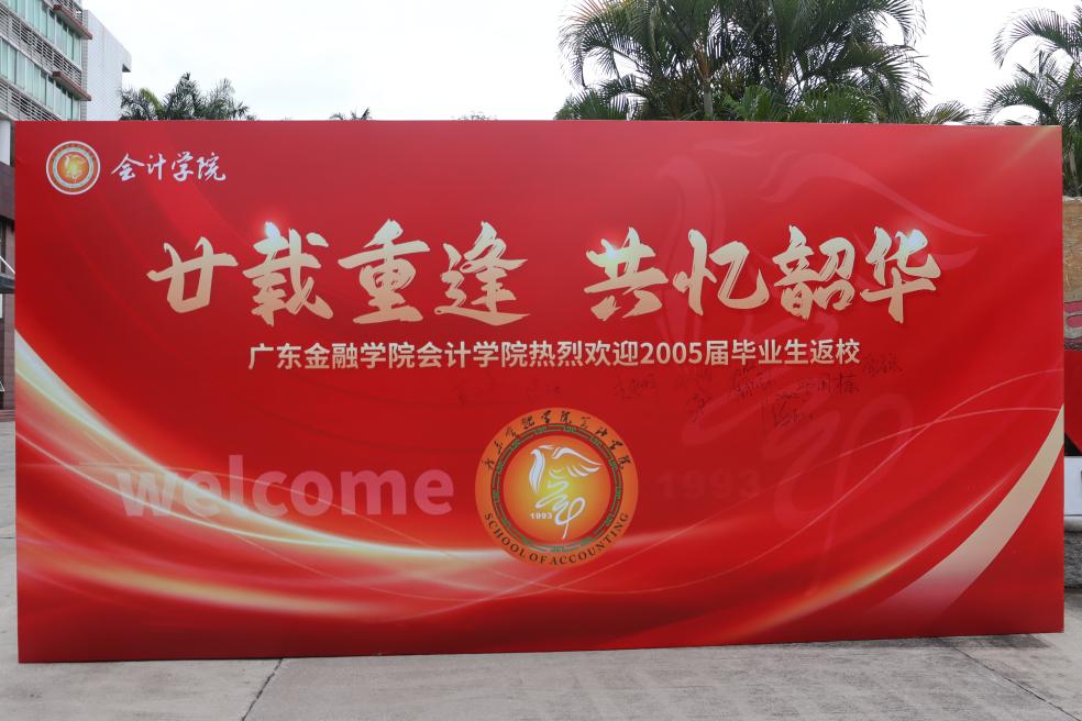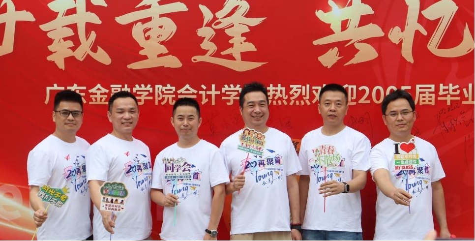 上午10时,校友们陆续回到充满回忆的校园。在报到处,曾经熟悉的面容再次相聚,大家热情相拥、亲切问候,往日的同窗情谊瞬间升温。报到结束后,校友们穿上统一的纪念衫,在写有“廿载重逢 共忆韶华”的背景板前合影留念,记录下这珍贵的相聚时刻。随后,大家纷纷在背景板上签名,留下对母校的深情祝福。