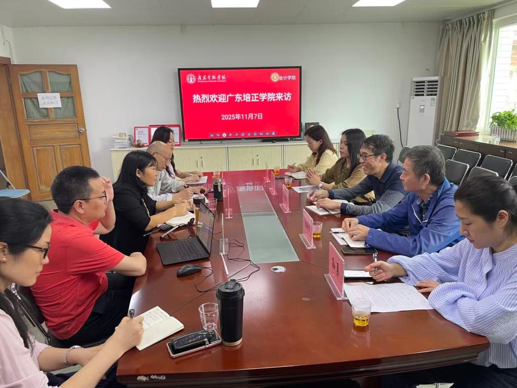 2025年11月7日上午,广东培正学院taptap点点体育副院长谭洪益一行五人来taptap点点taptap点点体育调研交流。taptap点点副院长温雅丽主持接待并主持召开专题交流会,会计系主任罗书章、智能会计系主任兼产业学院执行院长汤四新、财务管理教研室主任钟纯及许剑娜老师参加交流。