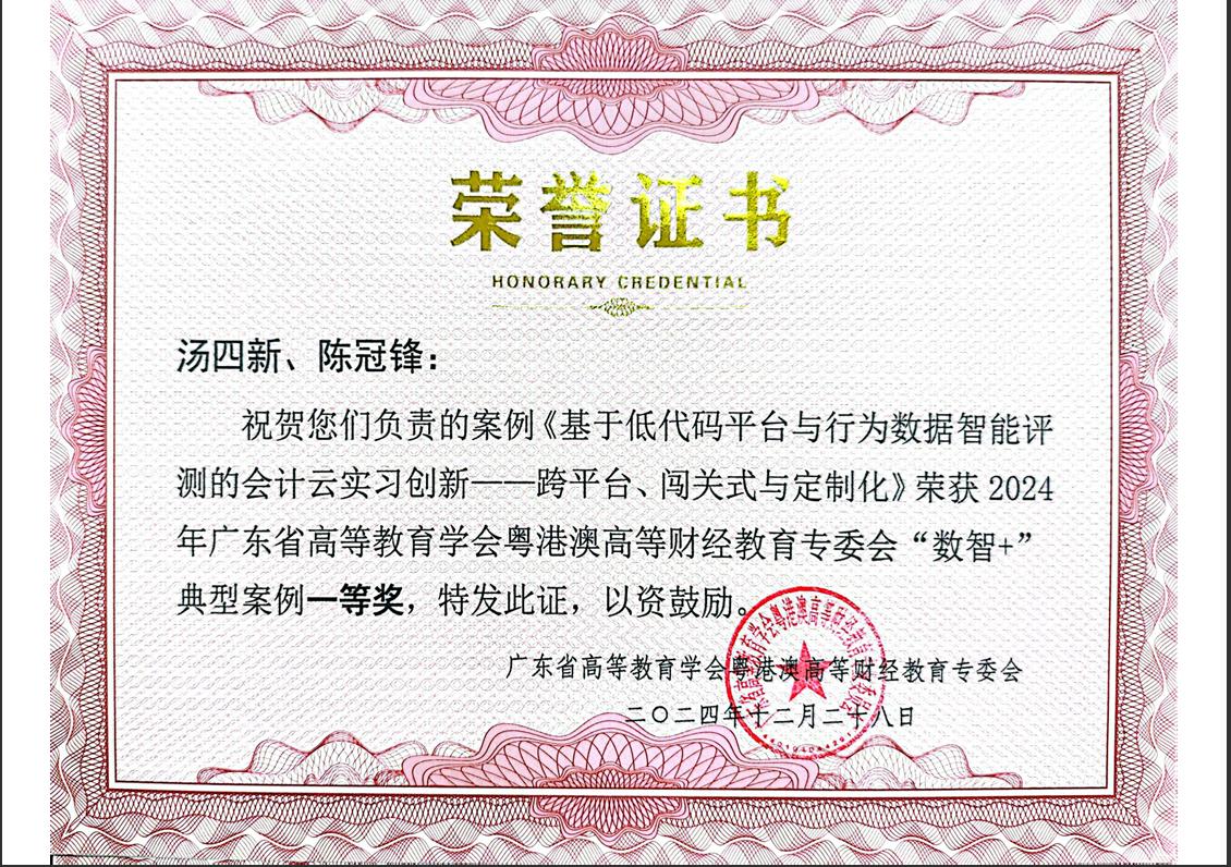 在2024年度广东省高等教育学会粤港澳高等财经教育专委会学术年会活动中,taptap点点智能会计与数字经管产业学院汤四新教授产教融合团队的《基于低代码平台与行为数据智能评测的会计云实习创新——跨平台、闯关式与定制化》案例,荣获了“数智”+典型案例一等奖。