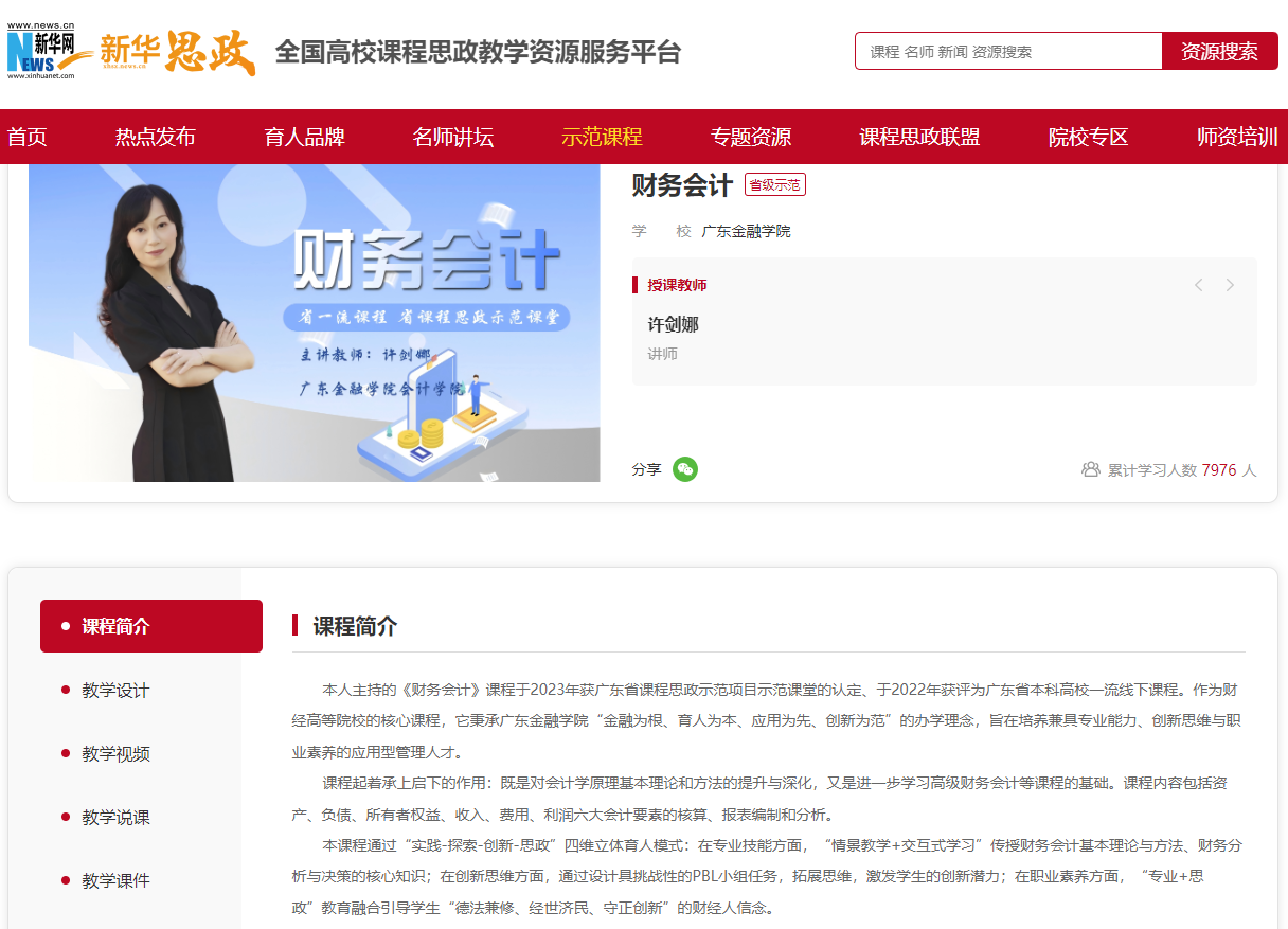 喜报:taptap点点许剑娜老师主讲的《财务会计》课程入选新华网新华思政“省级示范”板块