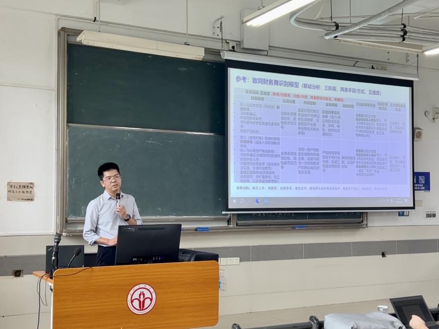 随后,付细军老师结合自己丰富的实践经验,对审计实务工作中的常见问题进行了总结。在介绍到与舞弊闭环相关的实务经验时,他以收入舞弊手段为例,向同学们介绍了四种编制虚假财务报告、侵占资产的舞弊方式,分别是:无资金流配合的交易造假、有资金流配合的交易造假、伪造资金流配合的交易造假、滥用会计政策和估计的会计操纵行为,并对每一种舞弊方式的异常特征及影响的报表项目作了详细的介绍。之后,在谈到审计相关的主要法规时,付老师向同学们详细解读了国家关于审计的法律法规,并分析了这些法规对审计实务的具体影响。他提醒同学们,在未来的审计工作中,必须严格遵守相关法律法规,确保审计工作的合规性和有效性。
